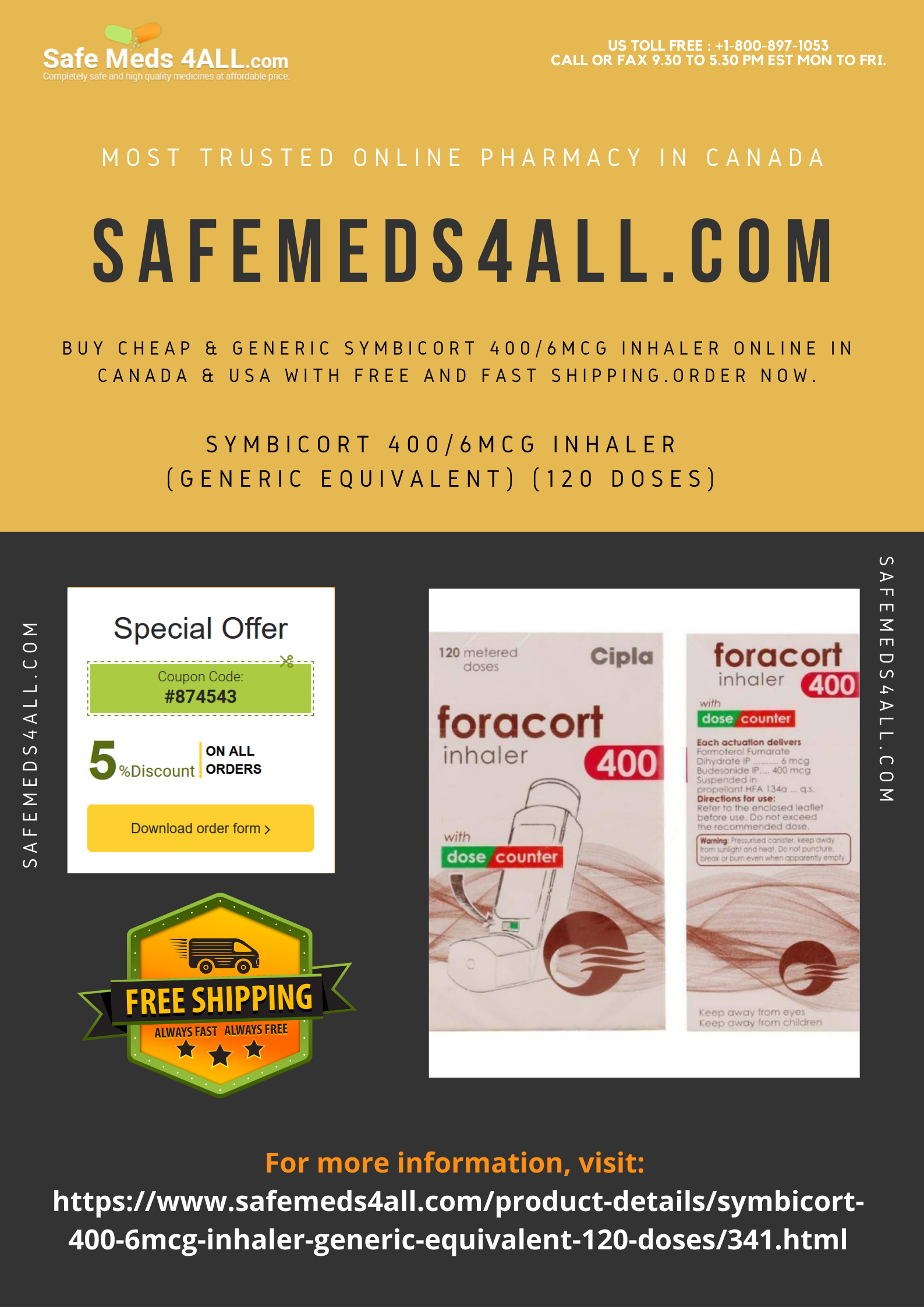 Symbicort 400/6mcg inhaler is a prescription medicine used to treat bronchospasm in people with asthma or chronic obstructive pulmonary disease. Buy symbicort 400/6mcg inhaler online from Safemeds4all at the lowest prices with free and fast worldwide shipping. For more information, visit: https://www.safemeds4all.com/product-details/symbicort-400-6mcg-inhaler-generic-equivalent-120-doses/341.html